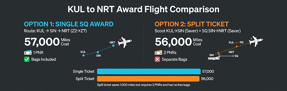 For connecting itineraries, the single-PNR SQ award through KUL–SIN–[destination] is the right tool. The 1,000-mile saving from split-ticketing with Scoot is not worth the baggage and connection risk.