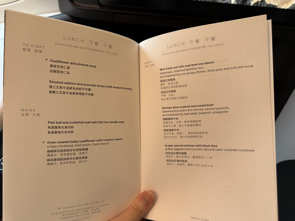 A few days before departure, I had the option to pre-select my meal via Cathay Pacific’s website. However, this was limited to choosing from the standard onboard menu rather than a true pre-order concept like Singapore Airlines’ Book the Cook. I’m aware that Cathay does offer more elevated pre-order dining on certain routes, such as London–Hong Kong, so this appears to be highly dependent on catering location.